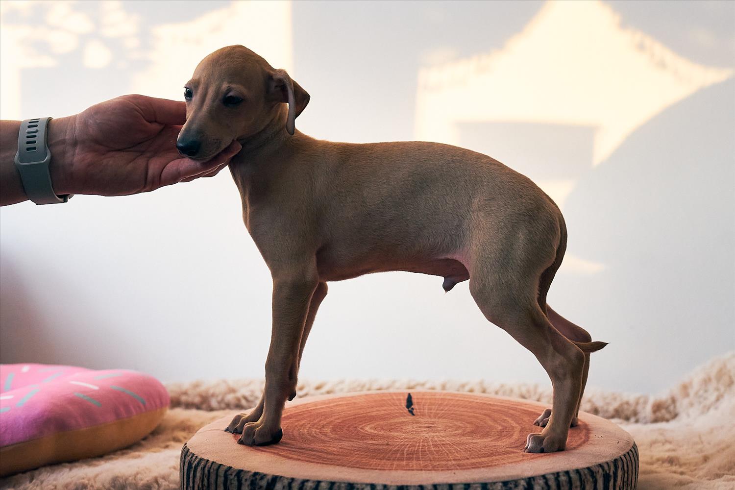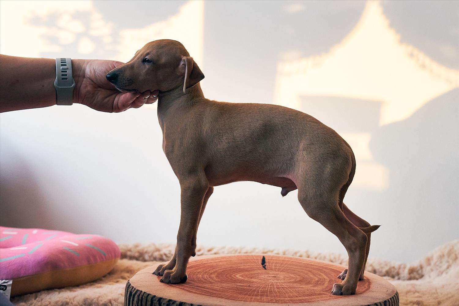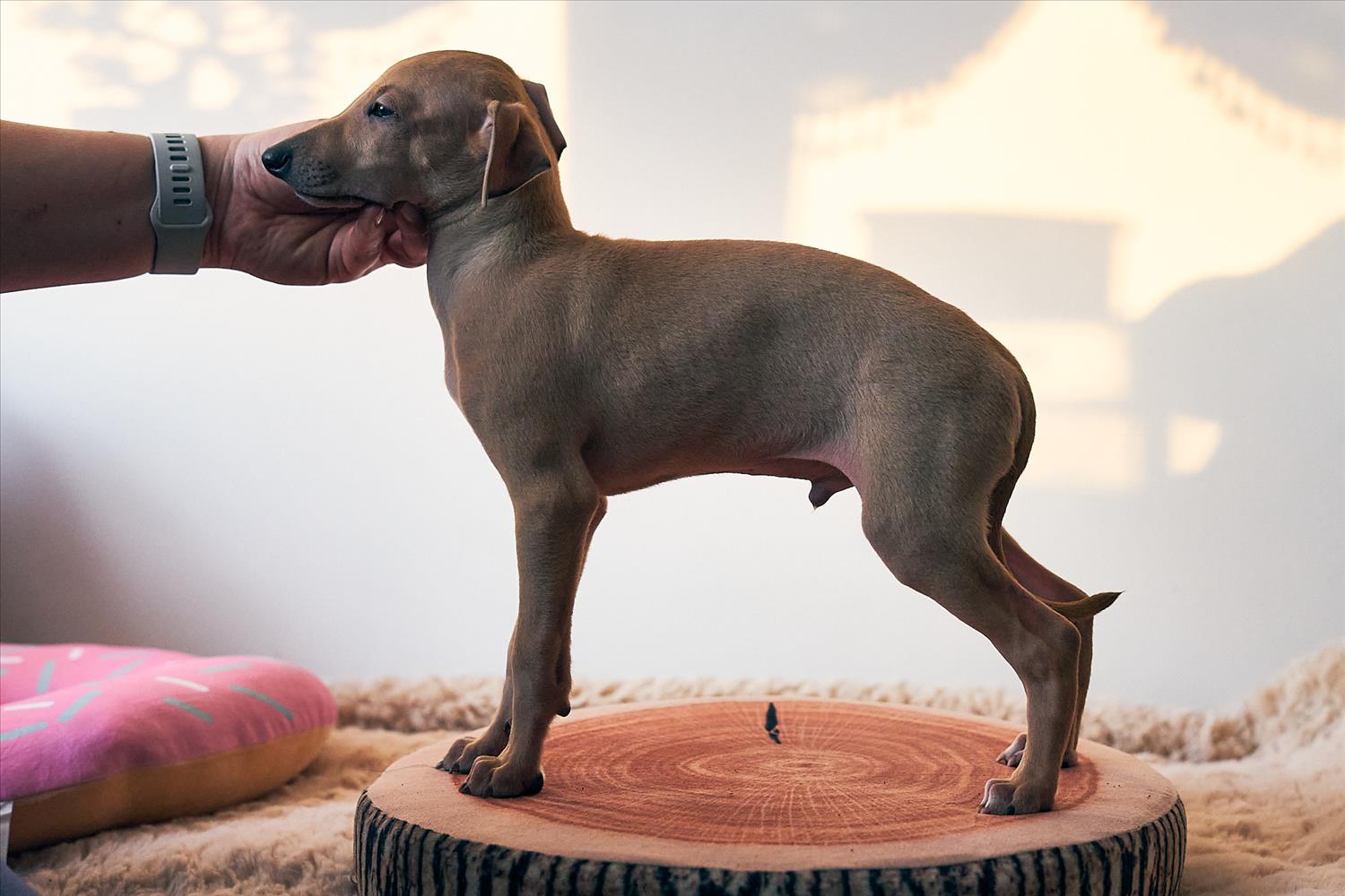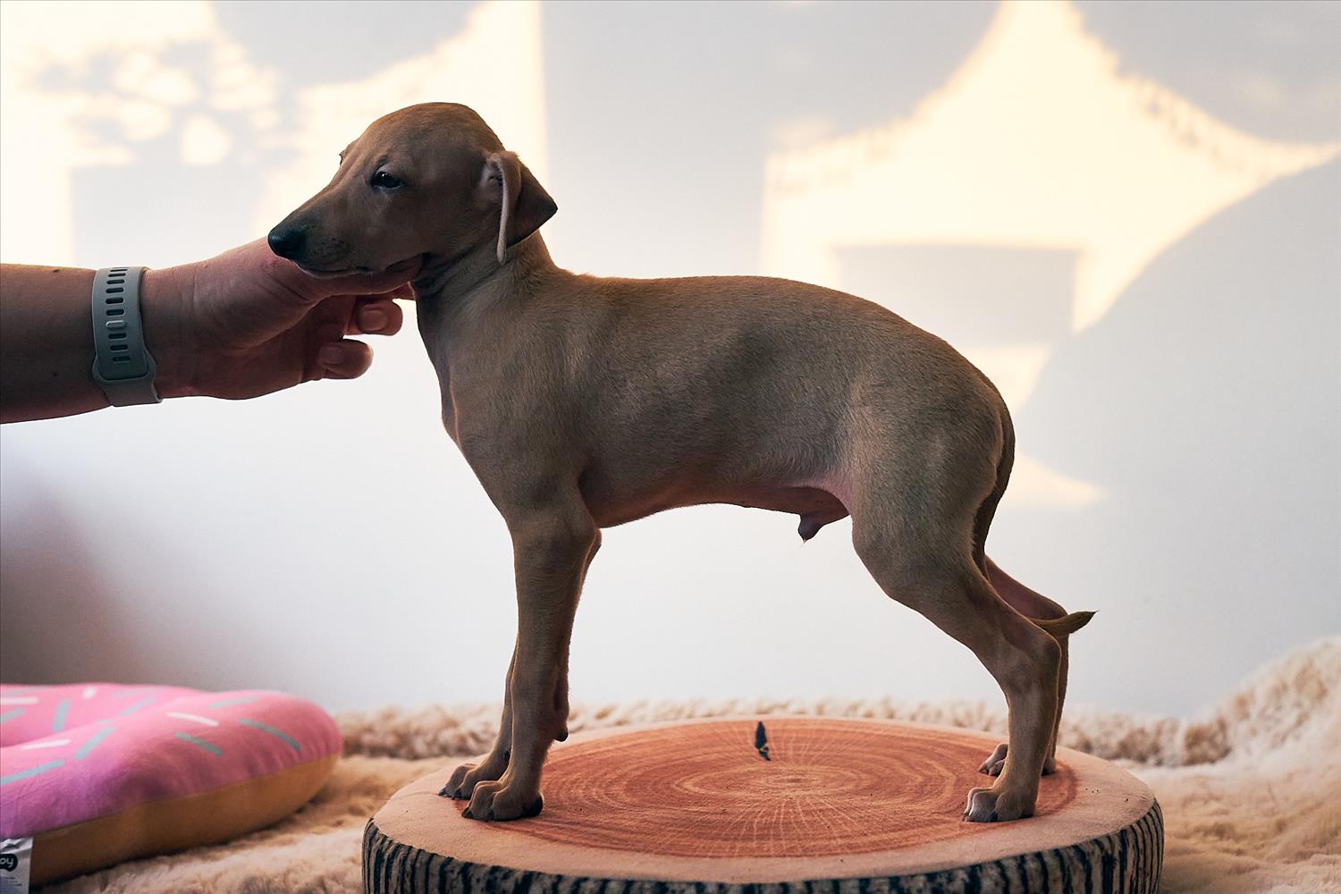 Macchiato – Macho – is Polish Junior Champion, Polish Junior Winner, and Polish Champion. He represents the ideal Italian Greyhound in both appearance and character. He captivates with his expression, large dark eyes, exceptional pigmentation, and balanced silhouette. At the same time, he is incredibly friendly and affectionate – a temperament he clearly passes on to his puppies.