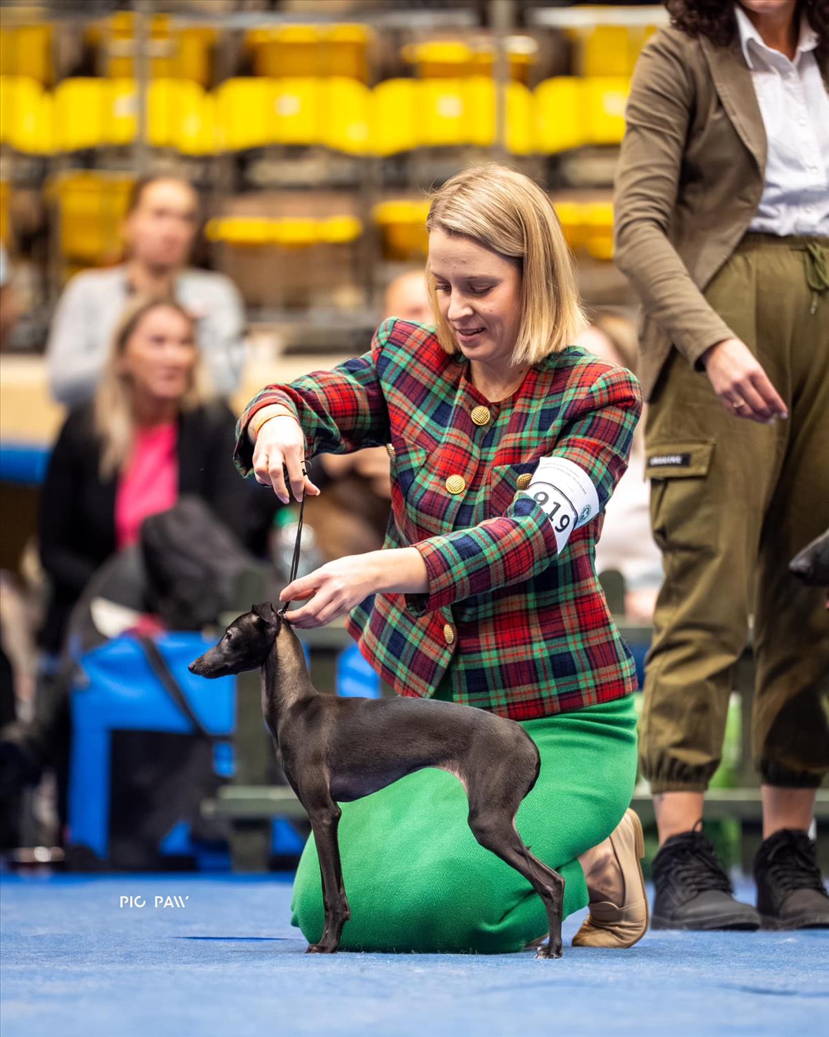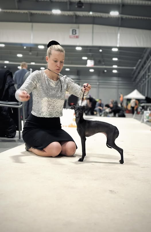 She is very nicely built, has a beautiful expression, big black eyes and nose, nice tiny ears and very nice italian greyhound shapes. In addition, she is of great height and will certainly be in the so-called standard, and she has an extremely sensitive and joyful character like her parents.