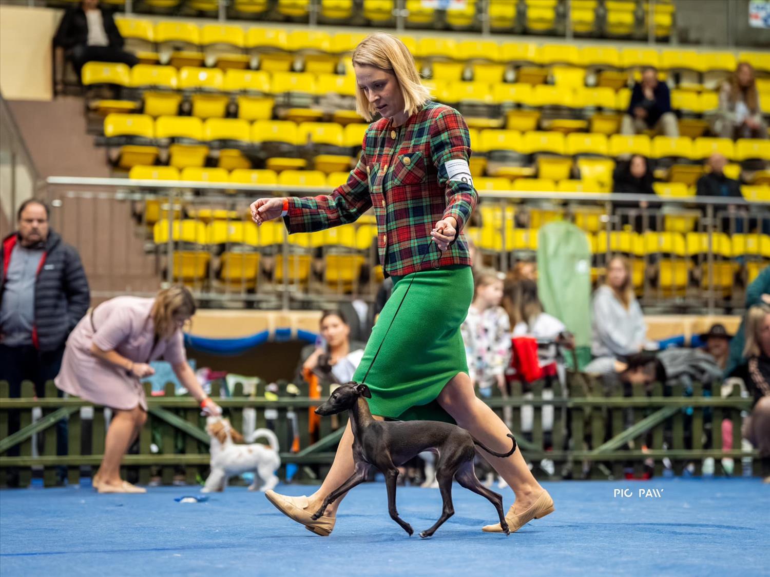 Zori to charciczka, do której nie można się o nic przyczepić. Jest bardzo ładnie zbudowana, ma śliczny wyraz, wielkie czarne oczy i nosek, fajne malutkie uszka i bardzo ładne charcikowe kształty. W dodatku jest świetnego wzrostu i będzie z całą pewnością w tzw standardzie oraz ma niebywale czuły i radosny charakter jak jej rodzice. Moim zdaniem ma kumulację wszystkich najlepszych cech rodziców i jest psem tak fajnym pod tyloma względami, że sprawdzi się zarówno jako pies na wystawy jak i do sportu oraz oczywiście najważniejsze - do kochania!